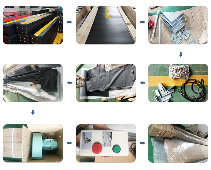 有頂部密封柱和兩個側密封柱。該材料為氯丁橡膠合成織物,密封柱為連續的圓柱形,由外部鼓風機連續充氣,各部分設有平衡孔。因此,整個工作狀態將緊緊地包裹著卡車車廂。達到密封效果。
